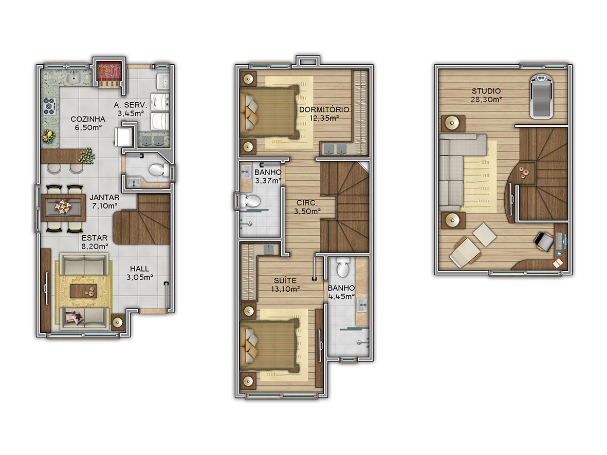 – Casas individualizadas, de 2 a 4 dormitórios, com pátio privativo, área de serviço, lavabo e cozinha integrada.